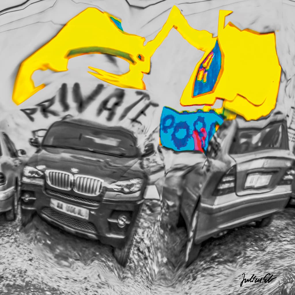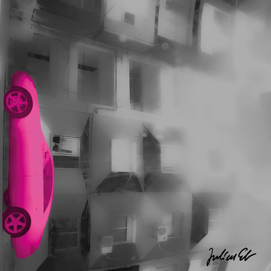 Equally meaningful is the use of the color pink. For example the luxurious car in front of a basic apartment building, is out of order and such vehicles are by some associated with illegal business practice, corruption or crime.